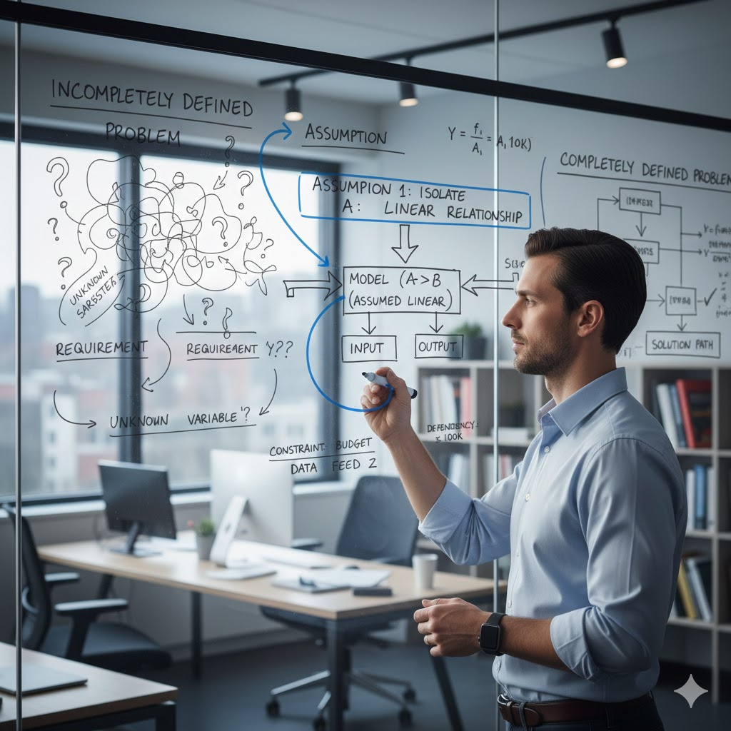 Assumptions fill the gap between an incompletely defined problem and a specific completely defined problem. They determine some unknown in an incompletely defined problem.